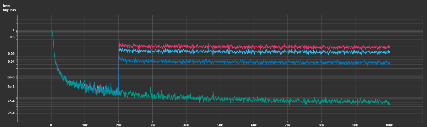 As you can see in the figure above, it's very obvious that adding the other losses (at several different weightings) results in the loss jumping multiple orders of magnitude and never quite declining the same. I'm still experimenting with this, with ideas being learned weightings to the losses, different warm-in strategies and others. It's still open.
